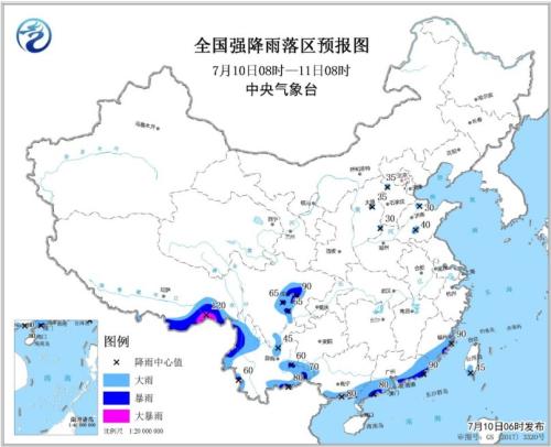 7月10日,據(jù)中央氣象臺網(wǎng)站消息,四川盆地西部、福建、廣東等地仍有較強(qiáng)降雨。預(yù)計,7月10日08時至11日08時,福建東南部、廣東東部和南部、廣西沿海、云南東南部和西部、四川盆地西部、西藏東南部等地有大到暴雨,其中,西藏東南部局地有大暴雨(100~120毫米),上述部分地區(qū)伴有短時強(qiáng)降水(最大小時降水量20~50毫米,局地可達(dá)60毫米以上)、局地有雷暴大風(fēng)等強(qiáng)對流天氣。中央氣象臺7月10日6時發(fā)布暴雨藍(lán)色預(yù)警。